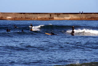 ![]() 淀江町(米子市)には、初心者向けのサーフィンスポットがあり、特に、淀江漁港西側はメッカです。ここは、親子連れのウィドサーファーもよく見ます。パウダーに近い遠浅の砂浜で、漁港の西側壁沿いの波は、かなり高いいい波になります。 |